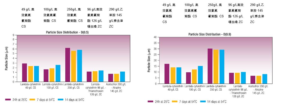 高效氯氰菊酯为低熔点原药,如未充分包覆成囊,容易出现晶体长大现象。但从图中可以看出,5个样品热贮后与初始的粒径分布只有微小的变化,表明使用Atlox™ CS100A & Atlox™ CS100B配制的配方稳定性好。